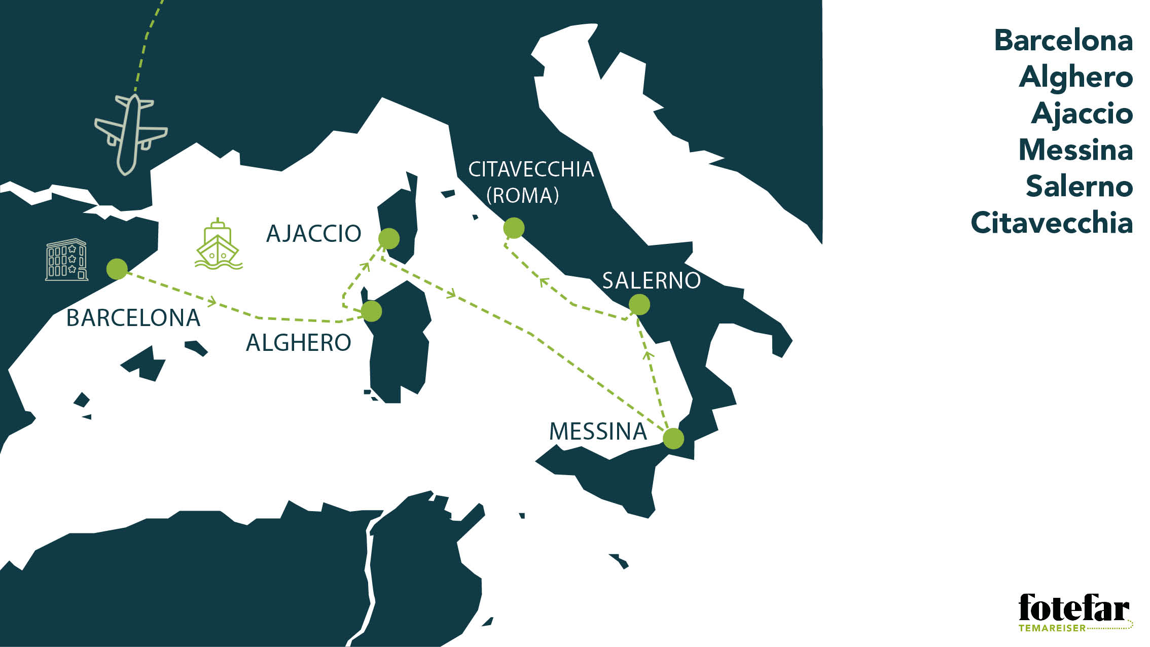 Barcelona - Alghero - Ajaccio - Messina - Salerno - Citavecchia (Roma).