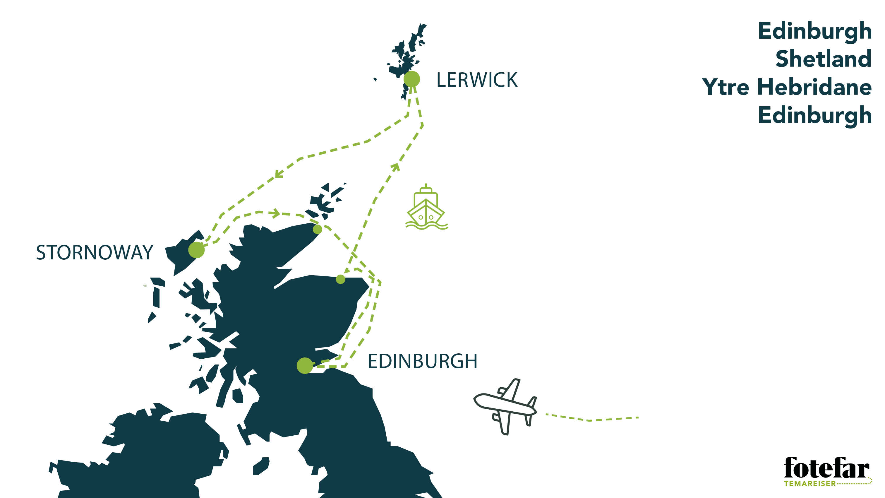 Vi startar med fly til Edinburgh, der vi overnattar før vi går om bord i cruiseskipet Balmoral. Derifrå går ferda via Troup Head til Lerwick, hovudstaden på Shetlandøyane. Skipet set så kurs vestover mot den vesle fiskelandsbyen Stornoway på Hebridane før vi segler via Dunvansby Sea Stacks tilbake til Edinburgh. Etter cruiset kan ein bestille ein ekstra dag i Edinburgh for å få med seg det berømte Military Tattoo-showet, som ein absolutt bør få med seg minst ein gong i livet!